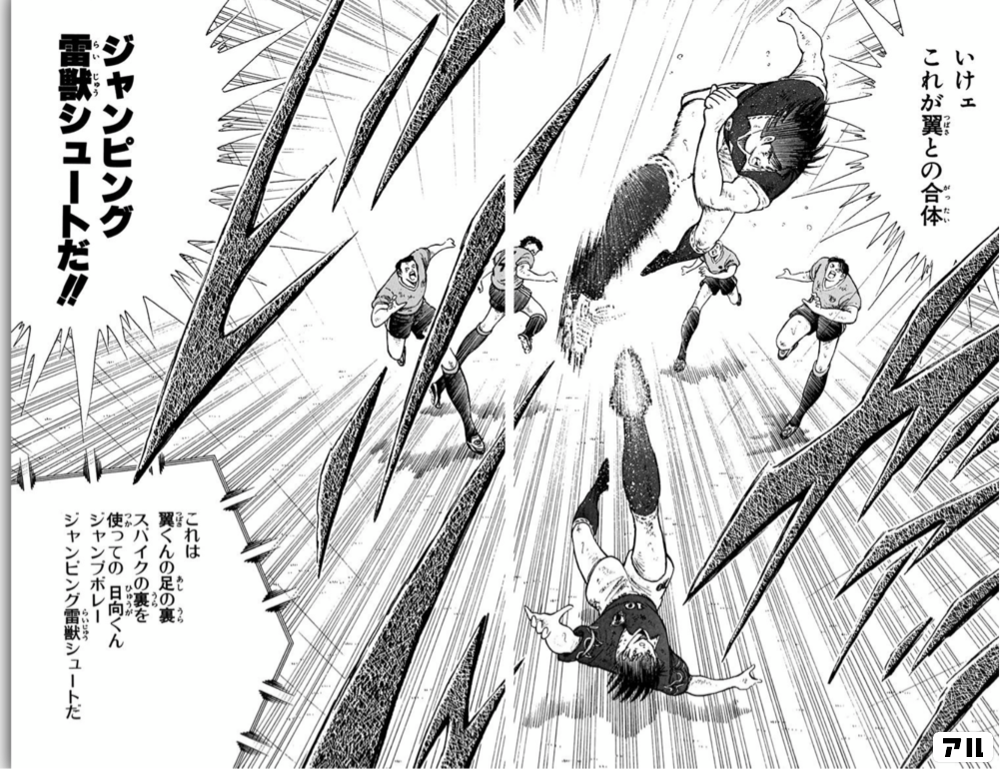 いけェ これが翼との合体 ジャンピング雷獣シュートだ これは翼くんの足の裏スパイクの裏を使っての 日向くんジャンプボレー ジャンピング雷獣シュートだ キャプテン翼 ワールドユース編 アル